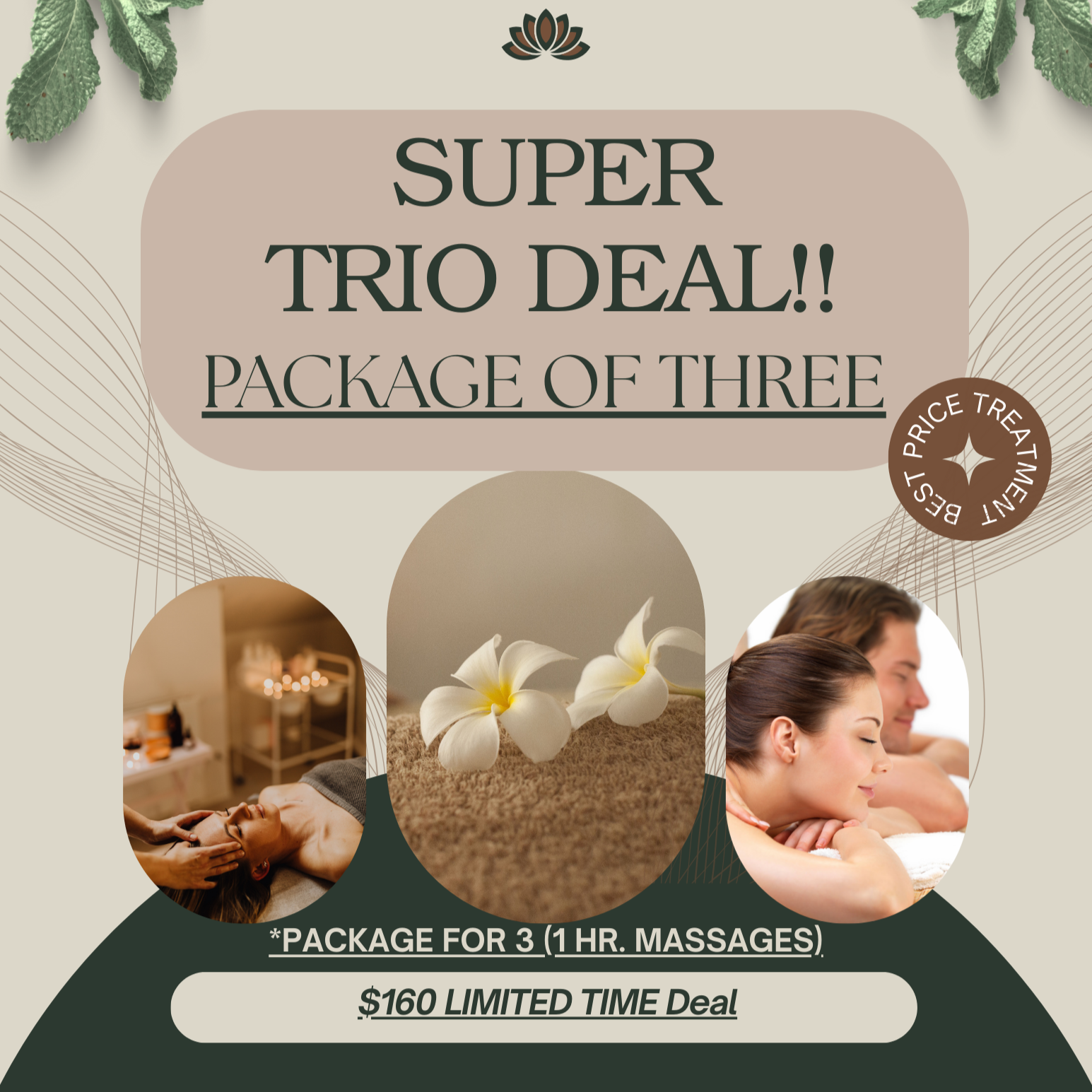 Three 1-hour massages for $160 total — same day, same time.